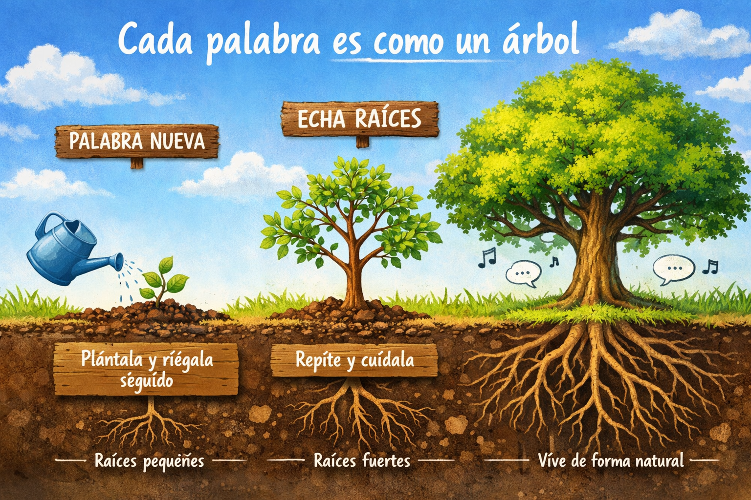 Con el tiempo, la palabra empieza a echar raíces. Ya no necesitas regarla todos los días. Basta con recordarla de vez en cuando. Y un día, sin darte cuenta, esa palabra se convierte en un árbol grande y fuerte. Ya no tienes que repetirla conscientemente, porque vive en tu cabeza de forma natural, alimentada por el uso diario… igual que los árboles grandes viven solo de la lluvia.